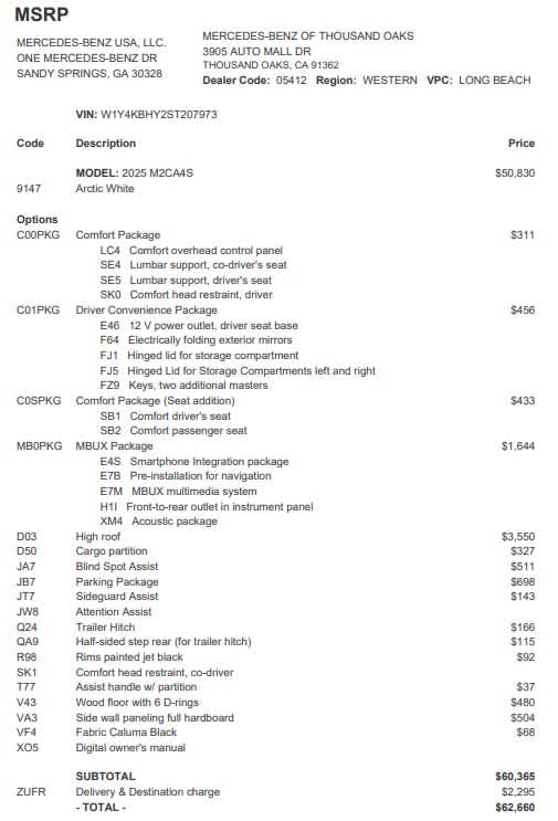 HIGH ROOF, MBUX PACKAGE: Pre-Installation for Navigation, Instrument Panel Front-to-Rear Outlet, Radio: MBUX Multimedia System w/10.25 Touchscreen, Smartphone Integration Package, Acoustic Package, PARKING PACKAGE, BLIND SPOT ASSIST, SIDE WALL PANELING FULL HARDBOARD Mercedes-Benz of Thousand Oaks is your local Mercedes-Benz dealership, serving the Thousand Oaks and Los Angeles Metro area since 1982. Our showroom always includes the most current luxurious and sophisticated Mercedes-Benz models. Were only a short trip from many communities, including Malibu and Simi Valley, and our team is happy to provide sales, financing, and automotive service and repair on site.